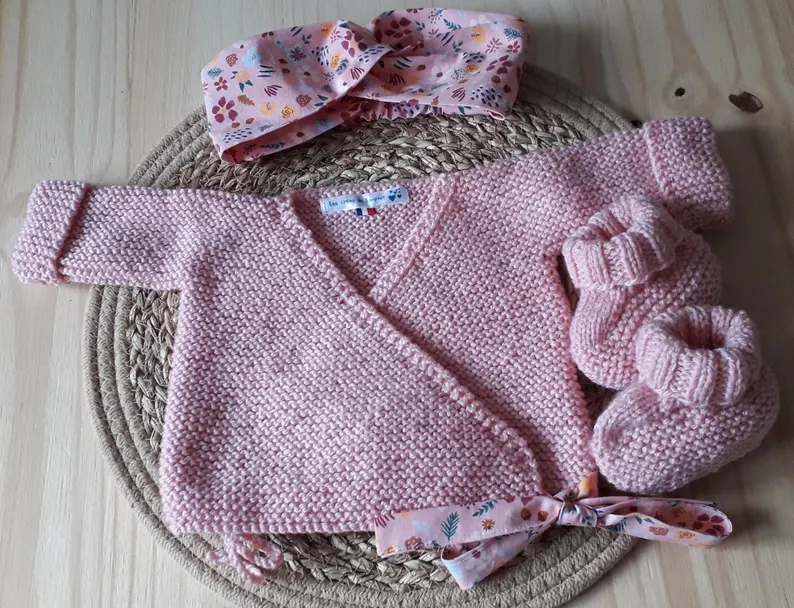 Coffret naissance bébé fille, brassière et petits chaussons en laine rose, bandeau assorti